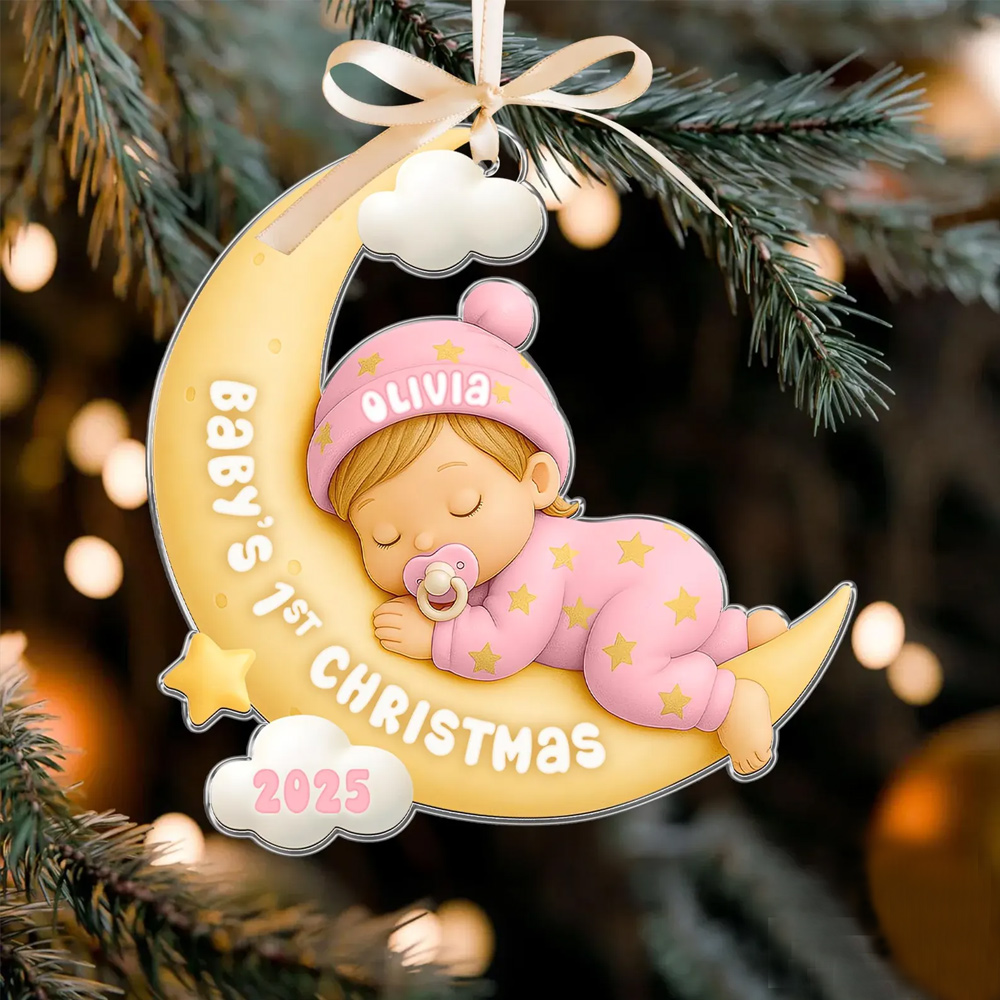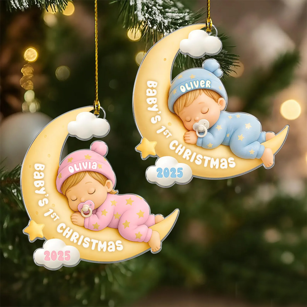 Celebrate a Magical Milestone - Commemorate your baby's first holiday season with this adorable Personalized Name & Year Ornament. Designed to capture the wonder of a newborn, this ornament features a sweet baby sleeping in a crescent moon, making it a charming keepsake for every new parent.